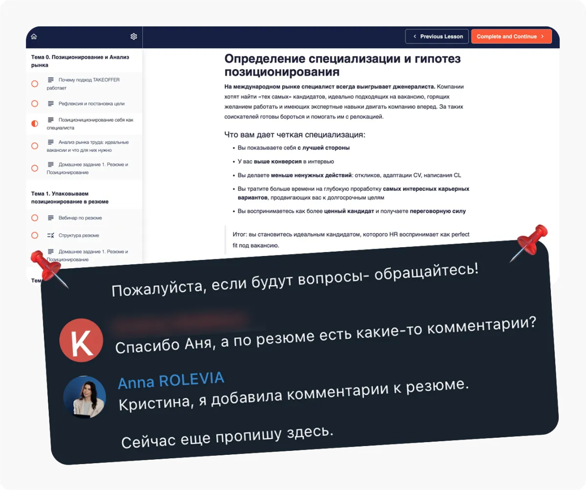 Неограниченное обратная связь в чате с куратором, ответы на любые вопросы (позиционирование, резюме, самопрезентация, LinkedIn, переговоры)